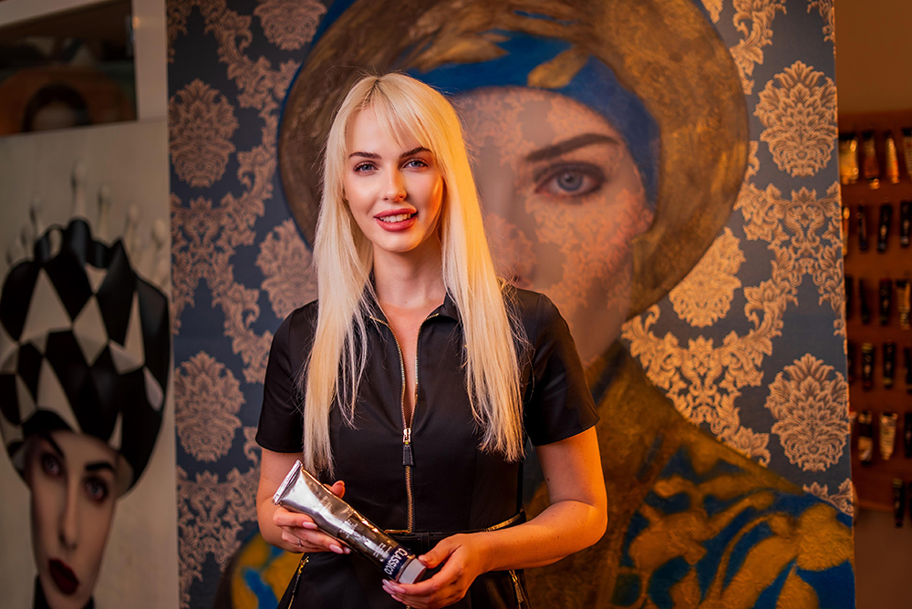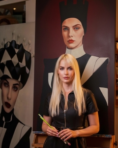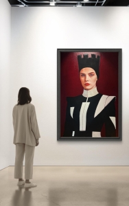 Simay Kışlaoğlu, figürlerini yalnızca bir portre olarak değil, aynı zamanda mimari bir yapı, bir karakter sistemi ve duygusal bir strateji alanı olarak kurguluyor. Keskin geometrik formlar, zırh benzeri kostümler, kale tepeli başlıklar ve neredeyse heykelsi bir duruş… Bütün bu unsurlar, esere hem tarihsel hem modern bir zamansızlık katıyor. Renk paletindeki derin kırmızılar, siyahların ağırlığı ve beyazın dramatik blokları, hem psikolojik hem de sahneleme etkisi yaratıyor.